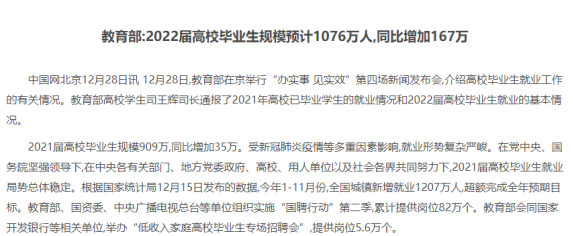 教育部公布的数据显示,2022届高校毕业生总规模预计突破1000万人,高校毕业生人数将达到1076万人,同比增加167万人,再创历史新高。另外因疫情影响,最近两年的海归留学生越来越多,导致高校毕业生又多了一批实力强劲的竞争对手,高校毕业生的就业压力或将变得更大,就业形势复杂严峻。