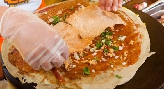 在薄饼上加一个鸡蛋,撒一把葱花,刷上酱料,最后再加一片脆果子。尤其是在冬天,捧着热腾腾的煎饼果子,每一口都是满满的幸福感。