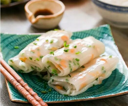 将调制好的米浆放入蒸笼,然后把肉末,鸡蛋,鲜虾等底料铺上,蒸熟后卷起装盘,蘸着特制的酱汁送入口中。正是大家称赞的味道:“白如雪,薄如纸,油光闪亮,香滑可口”。