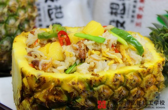 8.加盐,炒均,将炒好的饭放入菠萝盅即可。