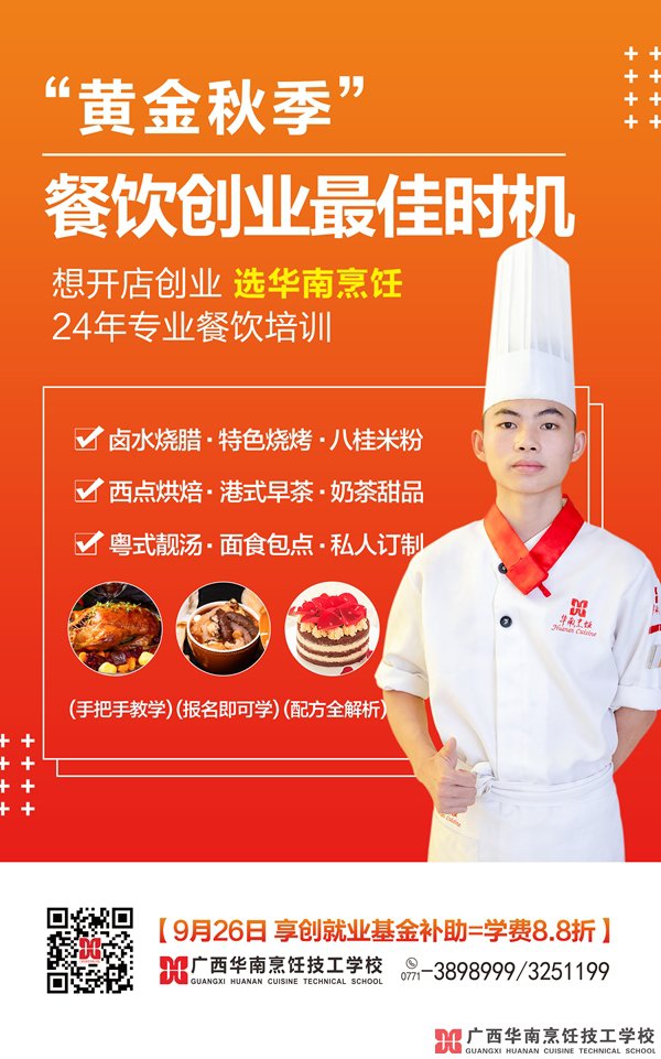 广西华南烹饪技工学校适合热爱餐饮行业、需短期内快速提升以及急需开店创业的烹饪爱好者!给自己一个学习烹饪的机会,还你一身专业的烹饪技能!