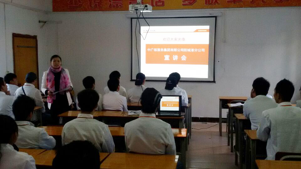 宣讲会上,中广核服务集团有限公司防城港分公司招聘宣讲团给同学们介绍企业的发展历程及未来企业的发展方向、企业的文化……,宣讲团结合PPT形象的介绍了本次招聘的岗位及薪资待遇、职业发展规划、住宿条件……。在互动环节企业和同学都进行了互相了解,最后宣讲团热烈的欢迎同学们加入到中广核服务集团有限公司防城港分公司这个朝气蓬勃的企业共同成长,发展未来。
