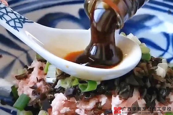 3、开始调味:肉馅饭碗中加入提前泡好的木耳切碎,再加入葱花,一勺生抽,一勺蚝油,一勺食盐,适量的胡椒粉,一勺食用油,一勺淀粉搅拌均匀。