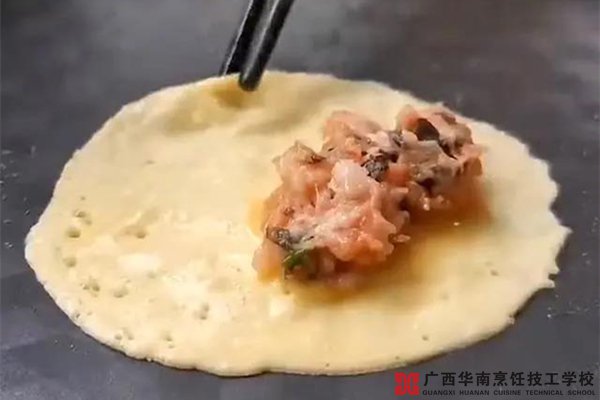 5、平底锅预热刷油倒入一勺蛋液摊成小饼,放入一勺做好的肉馅对折包上。