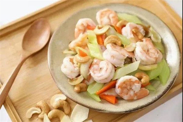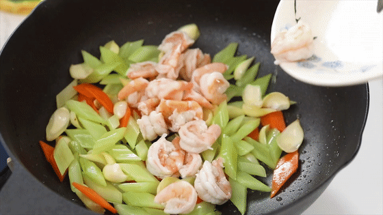 鲜虾300g、西芹1根、百合1个、胡萝卜1小勺、鸡蛋1个、淀粉30g、盐适量、油适量