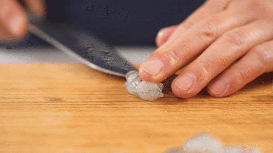 7、腌制好的虾仁,放入热水中焯水,颜色变红后捞出。