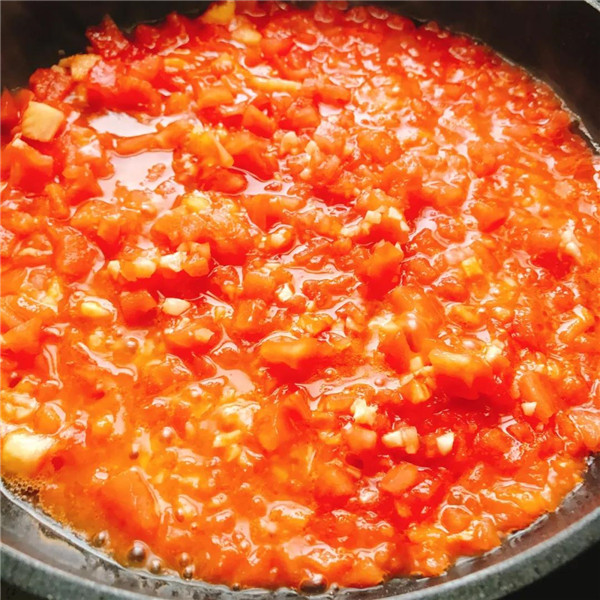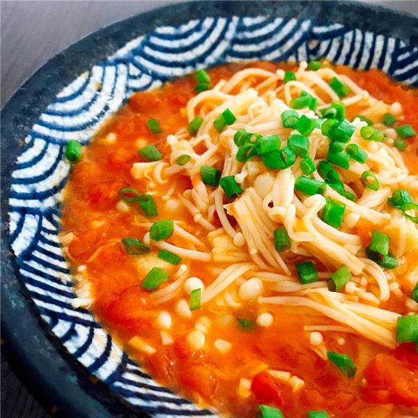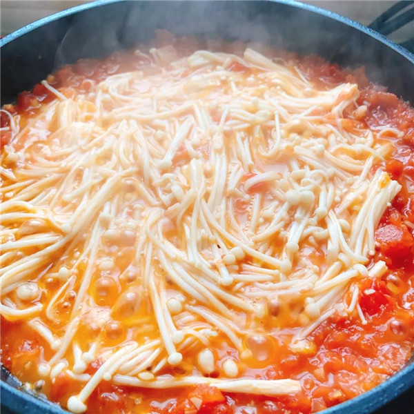 1、金针菇去根,洗净沥干水分;番茄洗净去皮,切成丁备用;锅内油热,下蒜蓉炒香后加番茄丁炒匀,番茄会出很多的水。