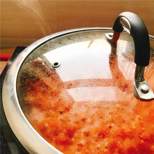 2、加盖中大火,焖煮8分钟。这步很重要,大火焖煮番茄才会出味道。