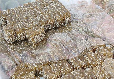 3.上麻:芝麻去皮炒熟后,均匀地铺于案板上,将冷至60~70℃的糖泥置于铺好的芝麻上,擀平,撒芝麻少许,再擀平(不撒芝麻,将糖泥翻面再擀亦可),然后成型。成型制品一面芝麻多而均匀,一面芝麻少许。