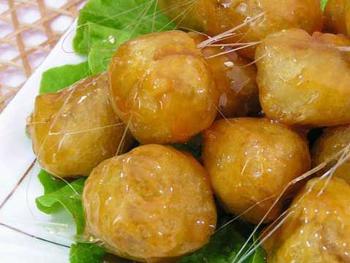 3、放入炸好的元宵,离火不断翻炒,待元宵均匀地粘满糖汁时,倒入抹油的盘内。