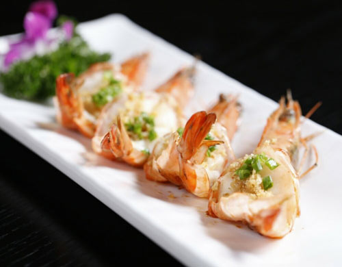 6、在开边虾上散上香葱装饰即可。