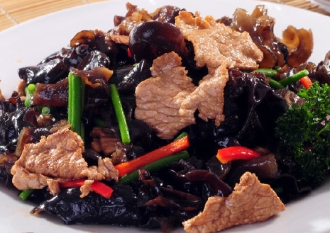 黑木耳、猪肉、青辣椒、红辣椒、辣椒、油、盐、酱油、生姜、葱