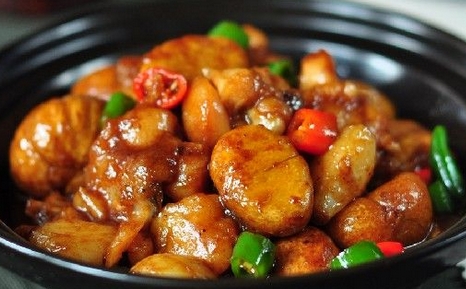 6、倒入牛蛙和板栗,大火烧开,小火焖5分钟,放入青红辣椒,大火收汁即可。