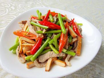4、锅烧热,放入油,烧热,下入肉丝,将肉丝滑熟;