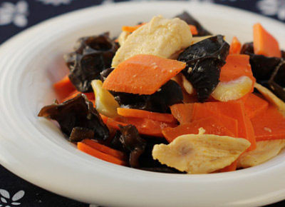 胡萝卜、木耳、鸡胸肉、鸡蛋清、淀粉、蒜、料酒、胡椒粉、油、盐