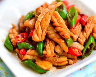 鱿鱼、尖椒、油、盐、鸡精、蒜、料酒、朝天椒、葱、豆瓣酱、胡椒