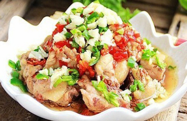 7、将切好的蒜末和辣椒末撒在蒸好的鸡块上;