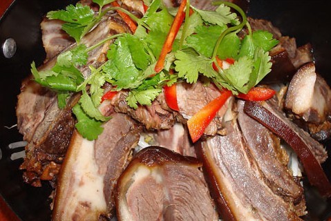 2、放入大锅,将全部调料一起下锅,加水至浸没,旺火烧滚后,再用中火,煮至酥烂出锅,冷却后拆骨;