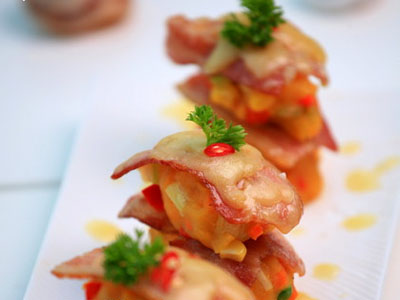 6、奶酪开始上色时,在面上撒上切成小丁的培根,继续烤大概10分钟,至奶酪和培根呈金黄色即可。