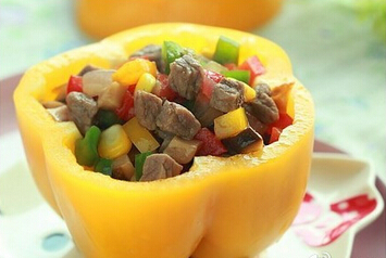 5、将炒好的牛肉蔬菜丁装入将黄色彩椒碗中,趁热食用即可。
