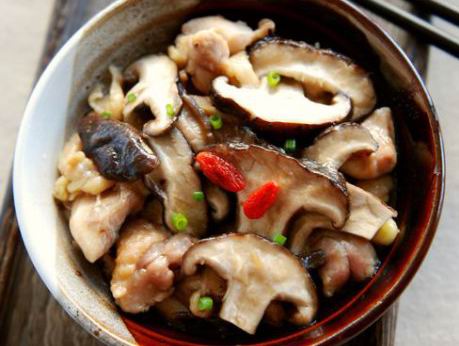 原料:鸡肉、香菇、盐、生姜、葱、枸杞、、料酒、荤油、鲍鱼汁、胡椒粉