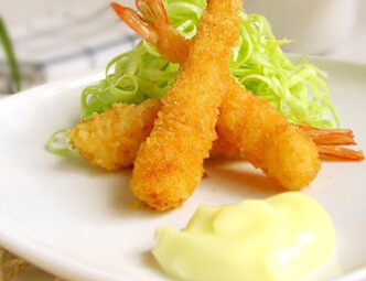 大虾、面粉、鸡蛋、面包糠、盐、料酒、白胡椒粉、蛋黄酱(各适量)