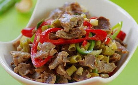 4、加入腌制好的鸡胗,炒至变色后,加入酸豆角。