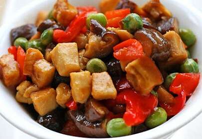 5.将鸡丁盛起,扒鸡肉的油留在锅中,依次下入红椒丁、青豆、香菇丁爆炒;