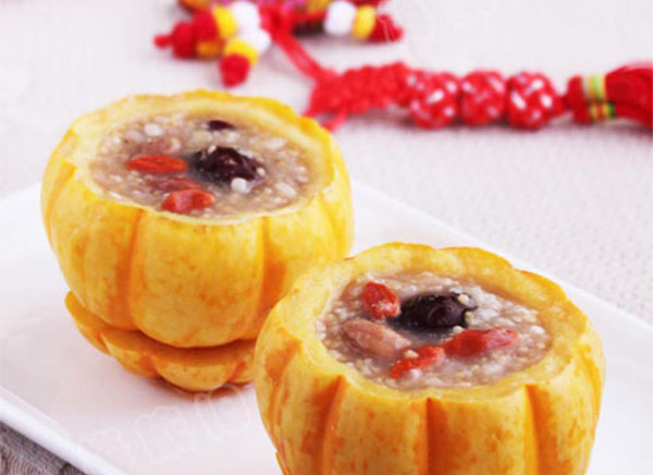 主料:大米(20克)、糯米(15克)、小米(15克)、燕麦片(15克)、枸杞(15克)、红枣(15克)、花生(20克)、薏仁米(15克)、小南瓜(2个)、蜂蜜(适量)、红糖(适量)