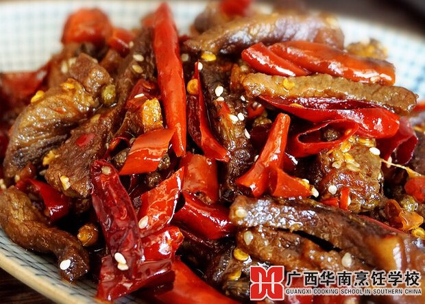 3、炒锅放油,待油热后加干辣椒、花椒、陈皮炒出香味,再放入葱、姜、牛肉、盐、白糖,汤煮开,改用中火收汁,汁快干的时候加入红油、麻油翻炒均匀,出锅晾晒装盘即可。
