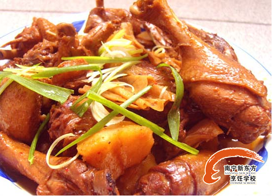 3炒锅热油,放干辣椒、姜、蒜爆香 ,放鸭肉翻炒。
