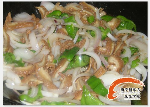 3、炒锅注葱姜油烧热,下入青红椒丝、香菜段略炒,烹料酒,加酱油、味精、盐、牛肚、炒匀出锅即成。