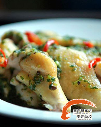 3、葱切碎,加入盐和凉后的花椒,一起剁成碎粒,铺在鸡块上面。步骤2中的油烧至冒烟后浇在调料上面,加入少许蒸鱼生抽和鸡汤即可