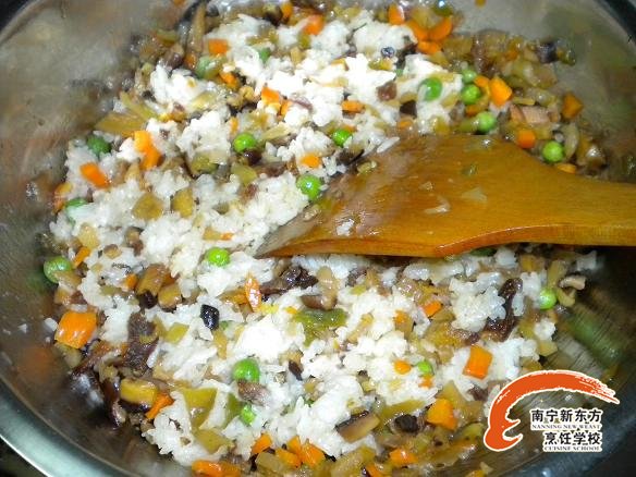 3、先炒香肠蔬菜等配料再将糯米饭拌匀,比直接把糯米饭放入油内炒要更省油更健康。