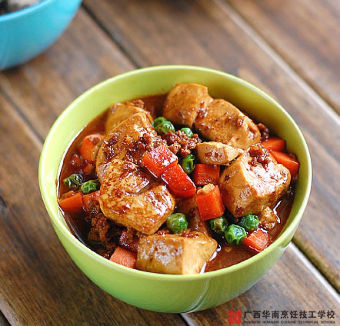 4、倒入豆腐,中小火炖15分钟左右(炖的时间长些,才能把肉的鲜味炖进豆腐里);胡萝卜切丁和豌豆倒入锅内;大火收汁即可;