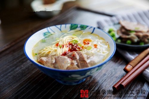 8、把粉丝、豆腐丝、切好的牛肉片盛到大些大碗里,根据牛骨汤的咸淡调入一点精盐,把滚开的牛骨汤浇入碗里,撒上切好的葱花,浇上油辣椒。喜欢蒜香的可撒上一点蒜粒。