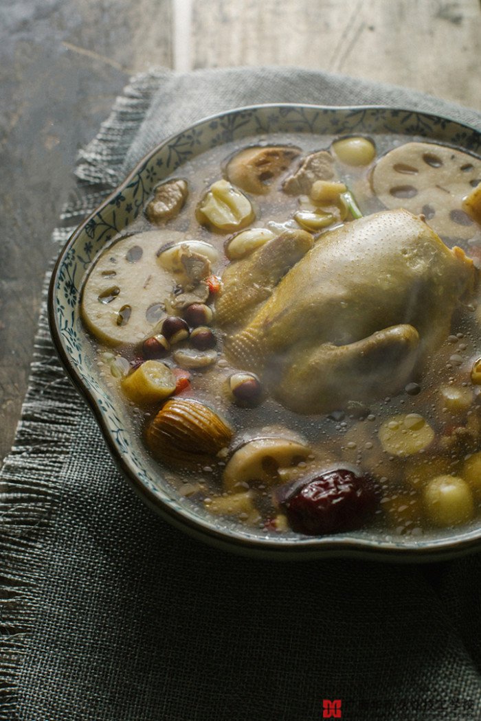 材料:乳鸽,猪展肉,莲藕,蜜枣,红枣,枸杞,莲子,生姜,沙参,盐。