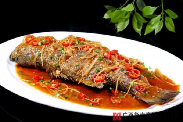 6、开盖加入适量的水、豆腐乳、姜丝、小红椒、老抽,盖上锅盖焖3分钟,3分钟后转成中小火,火大了会干汤。用滚汤浇烫鱼的上面一样可以将鱼弄熟(鱼煮后会软,菜鸟就别去翻了,免得弄烂了)。再加入适量的胡椒粉和鸡精,继续用滚汤浇烫,每个部位都要浇到。这样一道美味的湘乳烧鲈鱼就完成了。