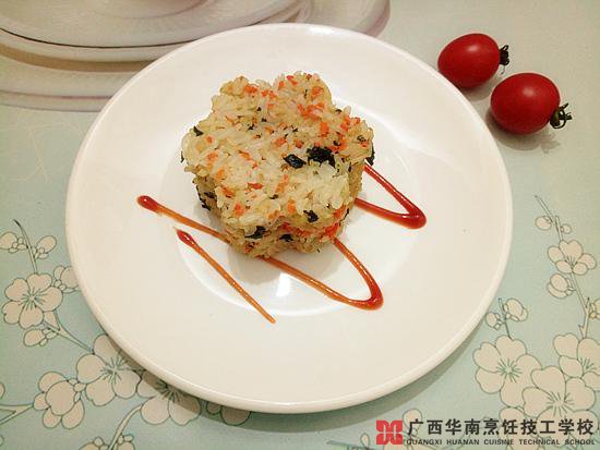 这样,美味的饭团就做好了!咸香可口,孩子一定非常喜欢。来广西华南烹饪技工学校,跟老师学更多菜肴制作方法。学厨师,就选广西华南烹饪技工学校!