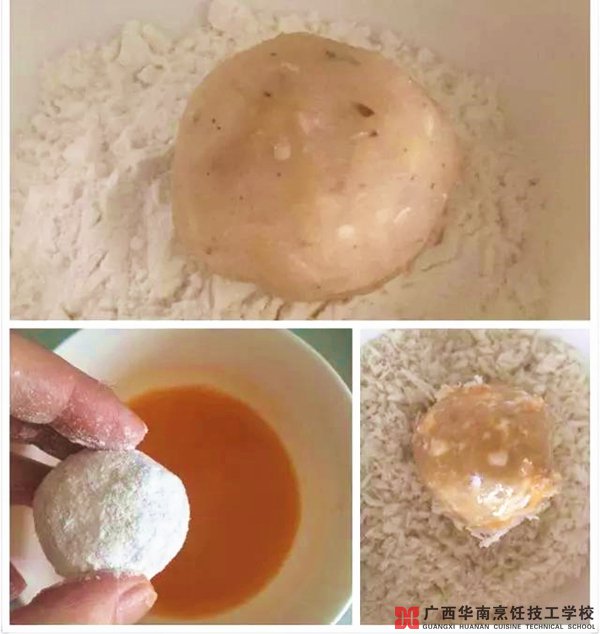 取适量虾土豆泥,压扁放入适量芝士,包起来。