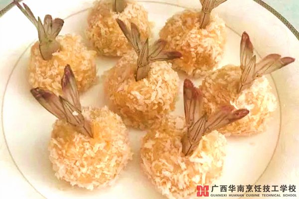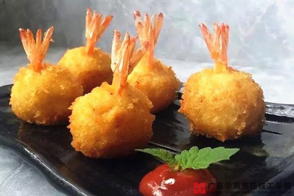 虾球依次放入淀粉、蛋液、面包糠里滚一圈儿。插上留好的虾尾,虾球就制作完成。