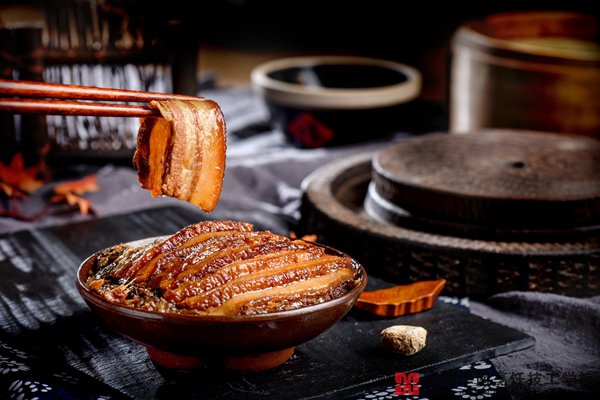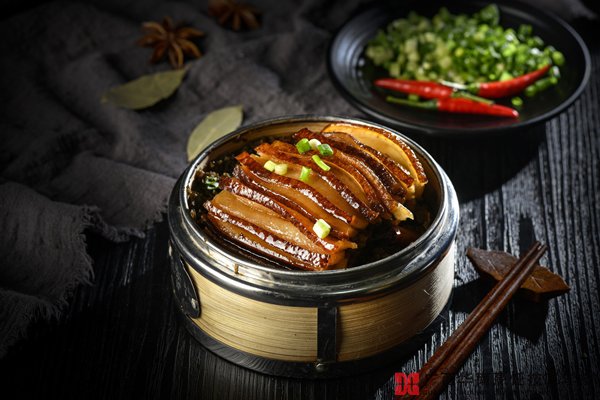 7、扣肉蒸好后,另起锅将水淀粉和5ml加热勾芡,浇至刚才蒸好的扣肉上即可。