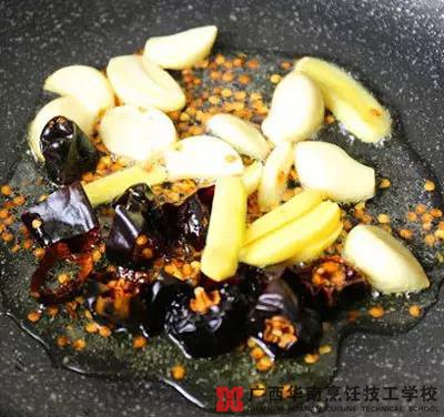 1、锅中入油,下大蒜、姜片、干辣椒煸炒。