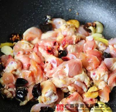 2、旺火时,加鸡块下锅快速煸炒。