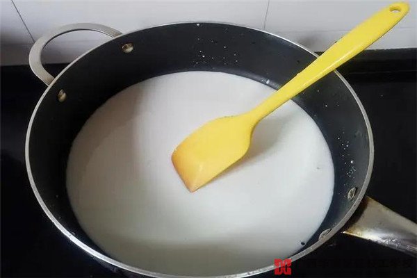 3、红豆、绿豆煮制期间,可以开始制作麻薯部分,把200克牛奶、20克木薯粉和16克细砂糖倒入锅内,开小火,一边搅拌一边熬煮。