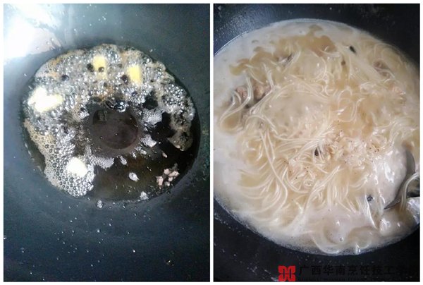 4.起油锅,放入豆豉姜片爆香,倒入热开水,放入面条煮三分钟