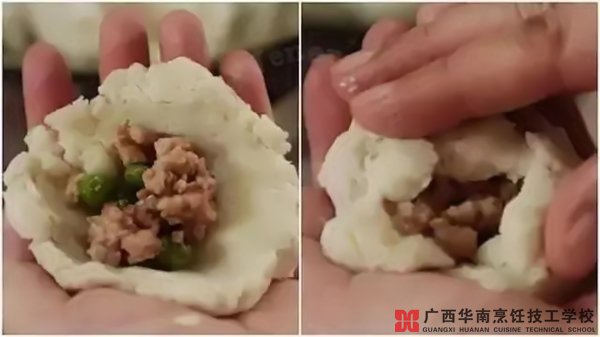 3.取一小块芋头,里面包上摊凉的猪肉豌豆馅料,包成圆团,以此类推。