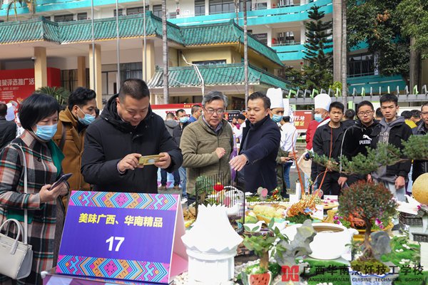 在现场的大师作品展示区,由广西桂菜尊师、广西桂菜导师以及广西烹协主席团各位烹饪大师制作的一道道美味佳肴吸引了众多年轻的厨师前来学习交流,纷纷拿出手机拍下精彩的瞬间,或是记录下大师现场展示的技艺,紧紧抓住每一个向大师学习的机会。