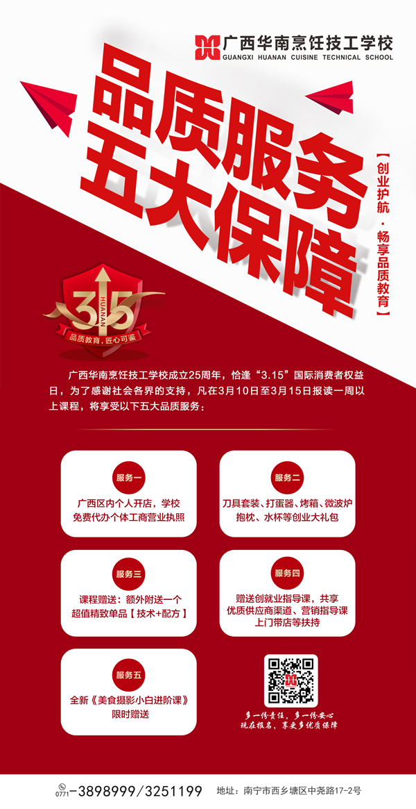 广西华南烹饪技工学校创办于1996年,至今已有25年办学历程。二十五年来不断探索创新教学模式,凝炼出鲜明的人才培养特色。