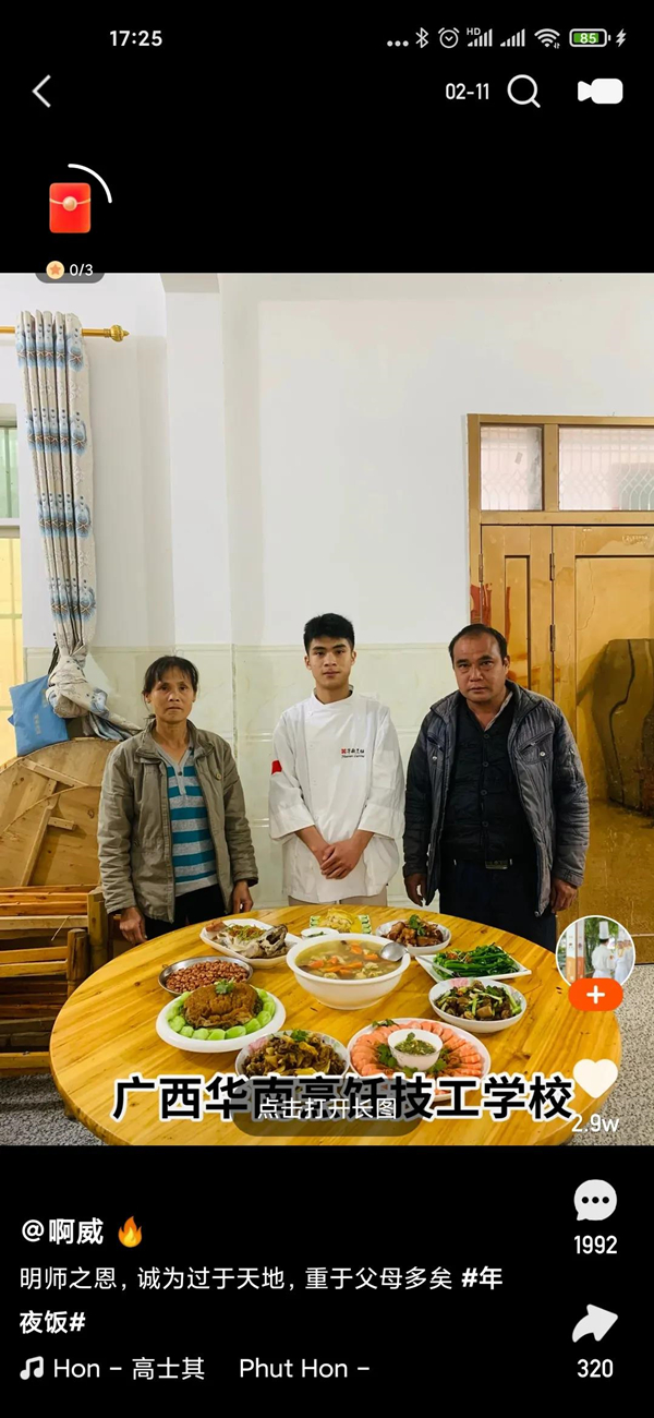 心中亲情,手中锅勺,过年期间华南烹饪学校开启了“我为家人做年夜饭”感恩活动,许多学子踊跃参加,集赞最多者即可获胜并赢得比赛奖金,接下来让我看看学子们都为家人做了什么丰盛的菜肴吧!